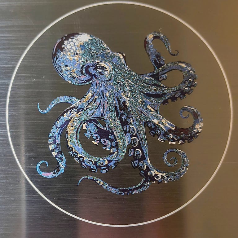 In 2025, I expanded my capabilities by acquiring my first MOPA laser, which enables me to etch vibrant, permanent colors onto stainless steel — opening up exciting new creative possibilities. I look forward to incorporating this feature into many upcoming projects.